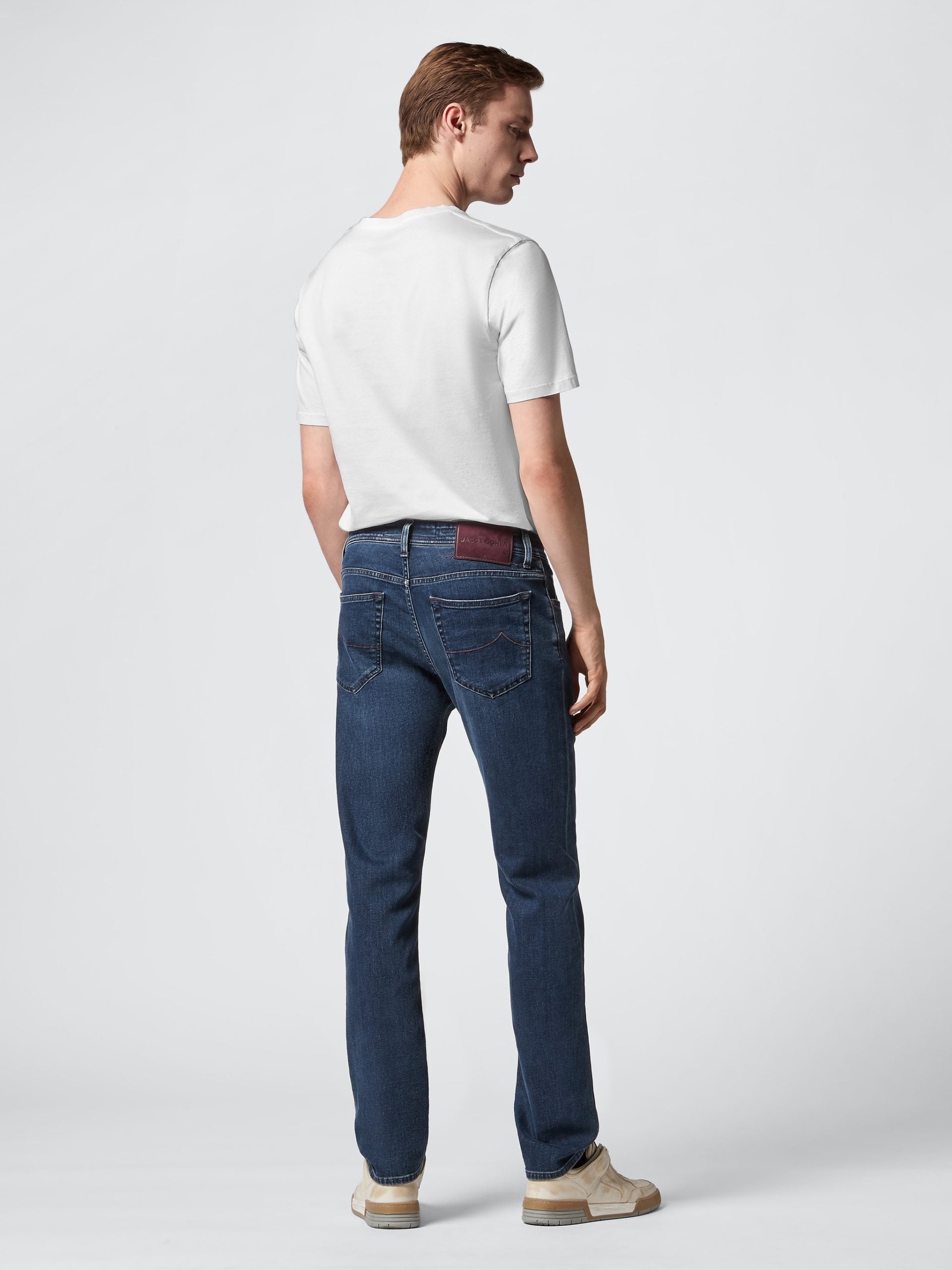 Jacob Cohen denim, blue color, five-pocket design, suede patch on the back, button closure on the front, regular fit. Made in Italy